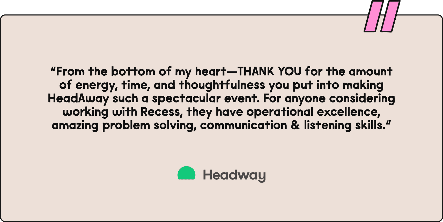 “From the bottom of my heart—THANK YOU for the amount of energy, time, and thoughtfulness you put into making HeadAway such a spectacular event. For anyone considering working with Recess, they have operational excellence, amazing problem solving, communication & listening skills.”